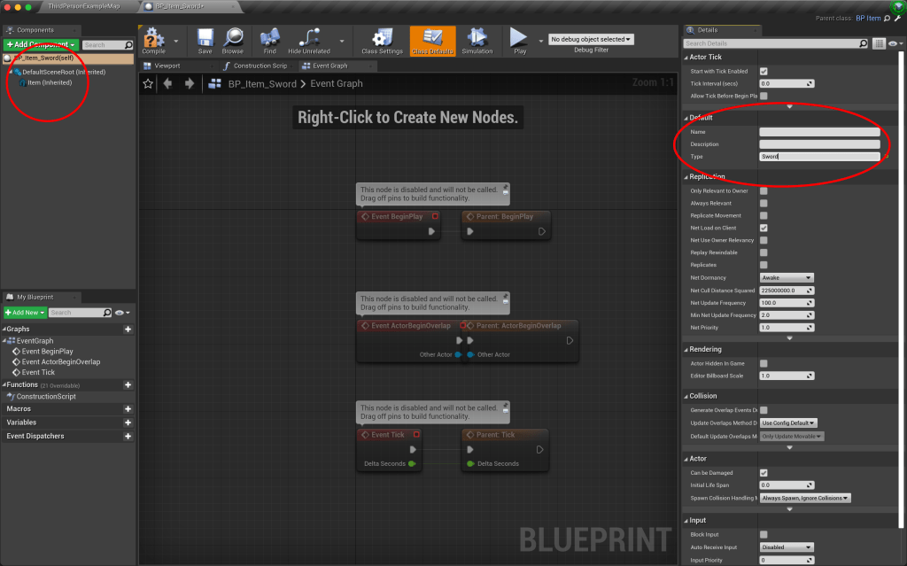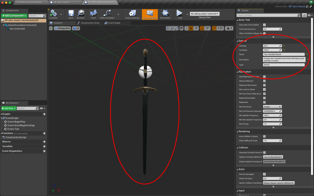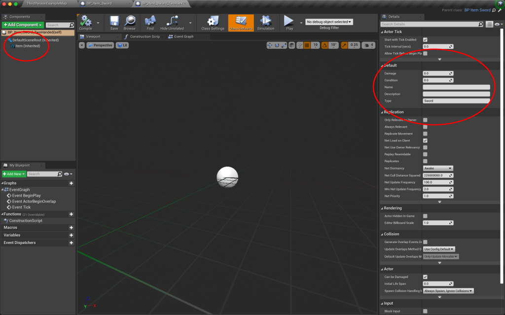 - This new derived class will now inherit everything from the base “BP_Item” class. If you open up the blueprint, you can see that it already contains a static mesh component. Now, we don’t see the “Name”, “Description”, and “Type” variables in the variables section. So where are they? They are now a part of the parent class, and so now will be available to set in the Class defaults section. The “Name” and “Description” will be unique to each item, but we know that every type of sword will be just that, a sword. So in the “Type” variable, we can put “Sword”.