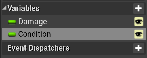 - Next let’s add specific variables unique to swords. We will add a new float variable called “Damage” and another float variable named “Condition”. Make them both visible.