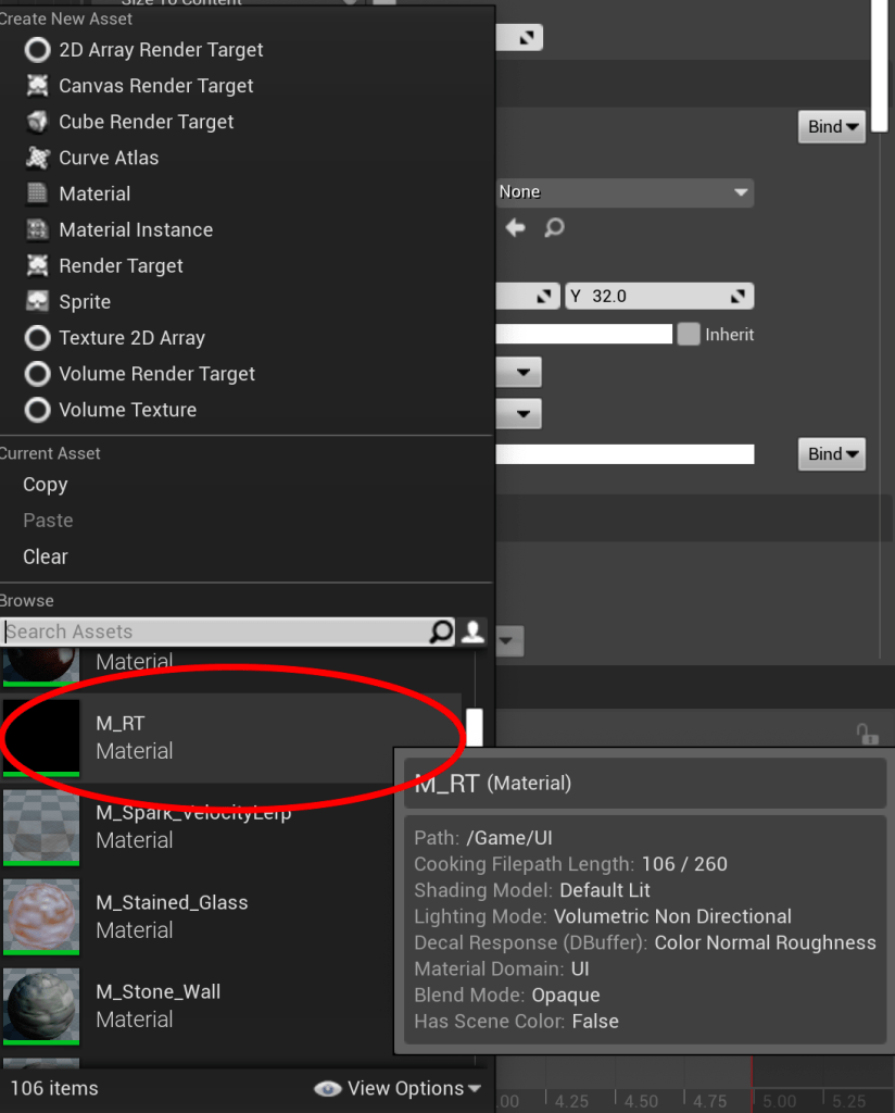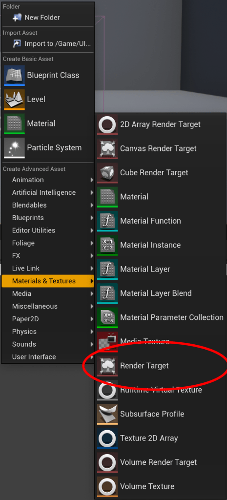 - Right click in the Content Browser and go to Materials & Textures, and create a new Render Target. Rename it whatever you wish.