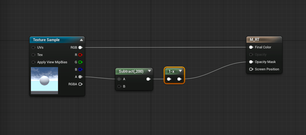 - Now let’s create a black and white mask based on the depth. Create a Subtract node and connect it to the Alpha of the Render Target. Depending on how far away your sphere actor is from the Scene Capture 2D actor will determine how much you will need to subtract from the Alpha. My Sphere is 150 units away from the Scene Capture 2D actor, so I am going to subtract 200. From the Subtract node, connect a One Minus node, and then connect that to the Opacity Mask of the Material.