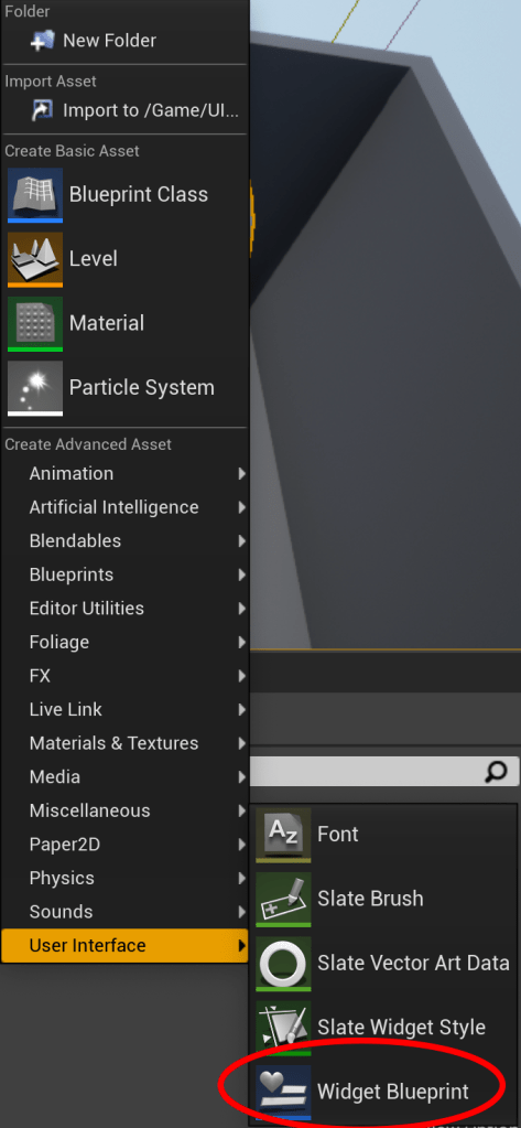 - Right click in the Content Browser and create a new Widget. Open it up.