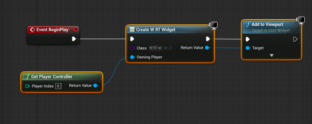 - Get the Player Controller and connect it to a Create Widget node. Choose the Widget we just created as the Class.